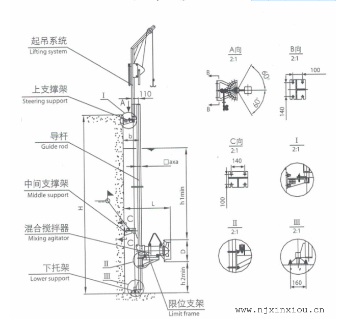 安装系统由不锈钢方钢导杆和起吊装置、不锈钢底部支座等组成,电机装在托架上。可自由调整搅拌机的提升和下降,并无须排空水池情况下拆卸和安装潜水搅拌器。潜水搅拌器全部的重量受力在它的支架上,此支架承受潜水搅拌器形成的推力。