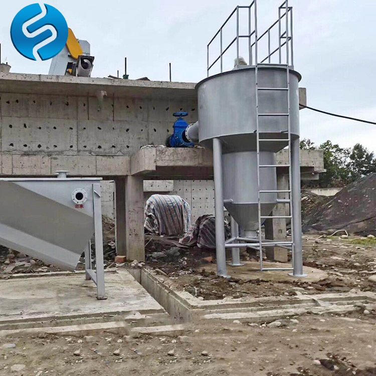 有平底园池和锥底园池两种,池底 有储砂斗,池内设有除砂机,除砂机由驱动装置、搅拌机、吸砂系统等组成,与后续砂水分离器等配套组成成套除砂处理设备,含砂废水在经过平而直的进水渠后,进水紊流减至低,进水渠末端是一个能产生附壁效应的斜坡,可使部分已沉降于渠道内的砂粒顺坡进入沉砂池,进水口处设有一阻流板(只装在小型池内),使冲出于板上的水流下折到选区的底板上。轴流式搅拌机则将水流带向池中心,然后向上,由此形成一个涡形水流,较重的砂粒在靠近池中心的一个环形孔口落入集砂区,进入砂斗内的砂可用气提吸砂或泵外排,而较轻的有机物由于搅拌机对于水的剪切作用,将有机质与砂粒分离,终随轴向流水体引向出水渠。