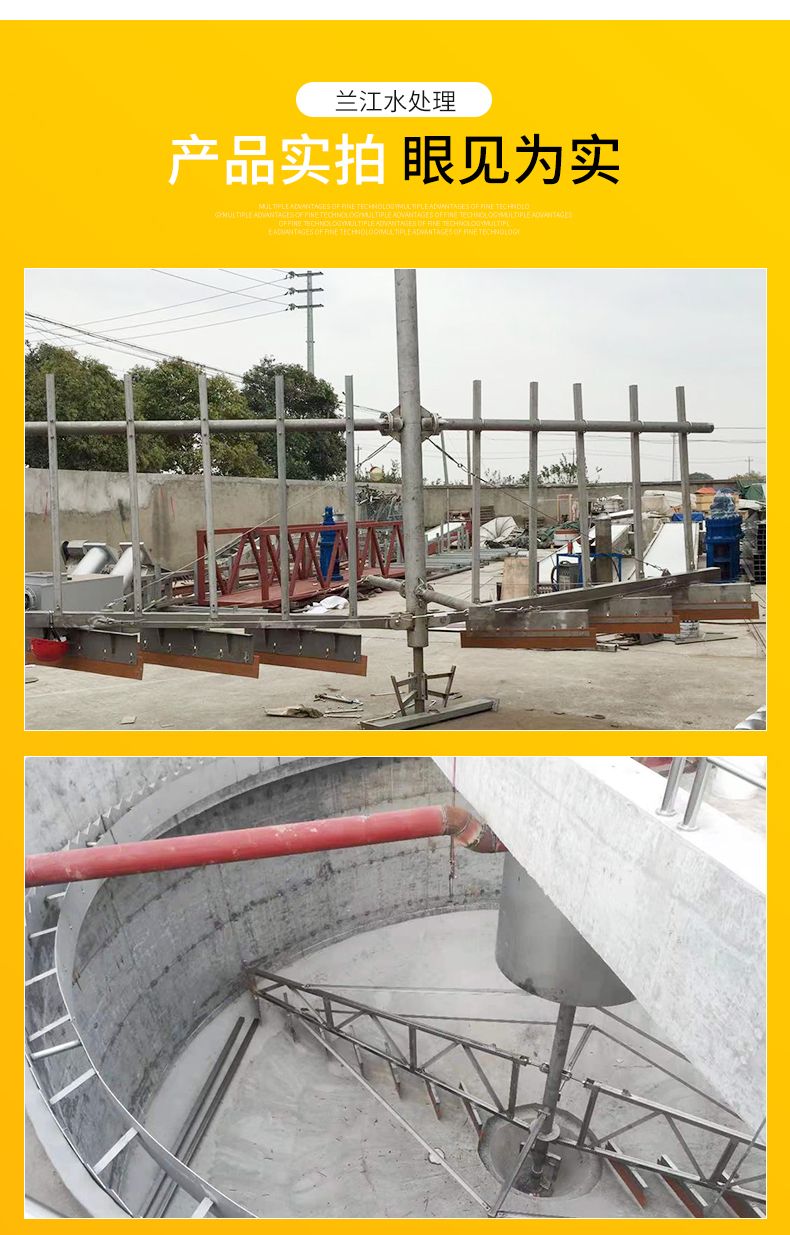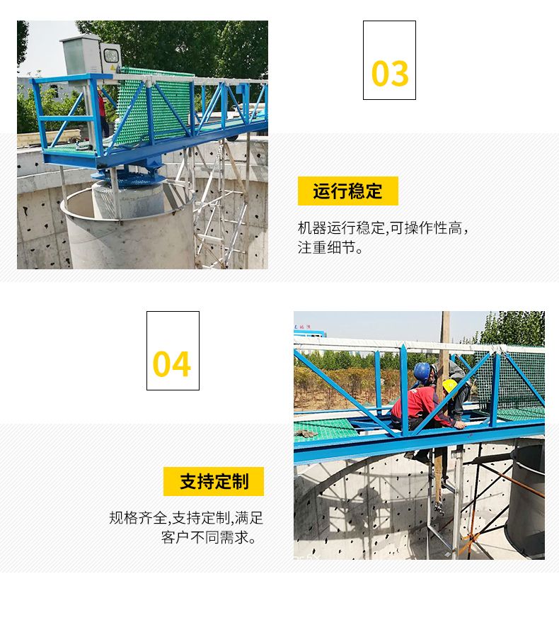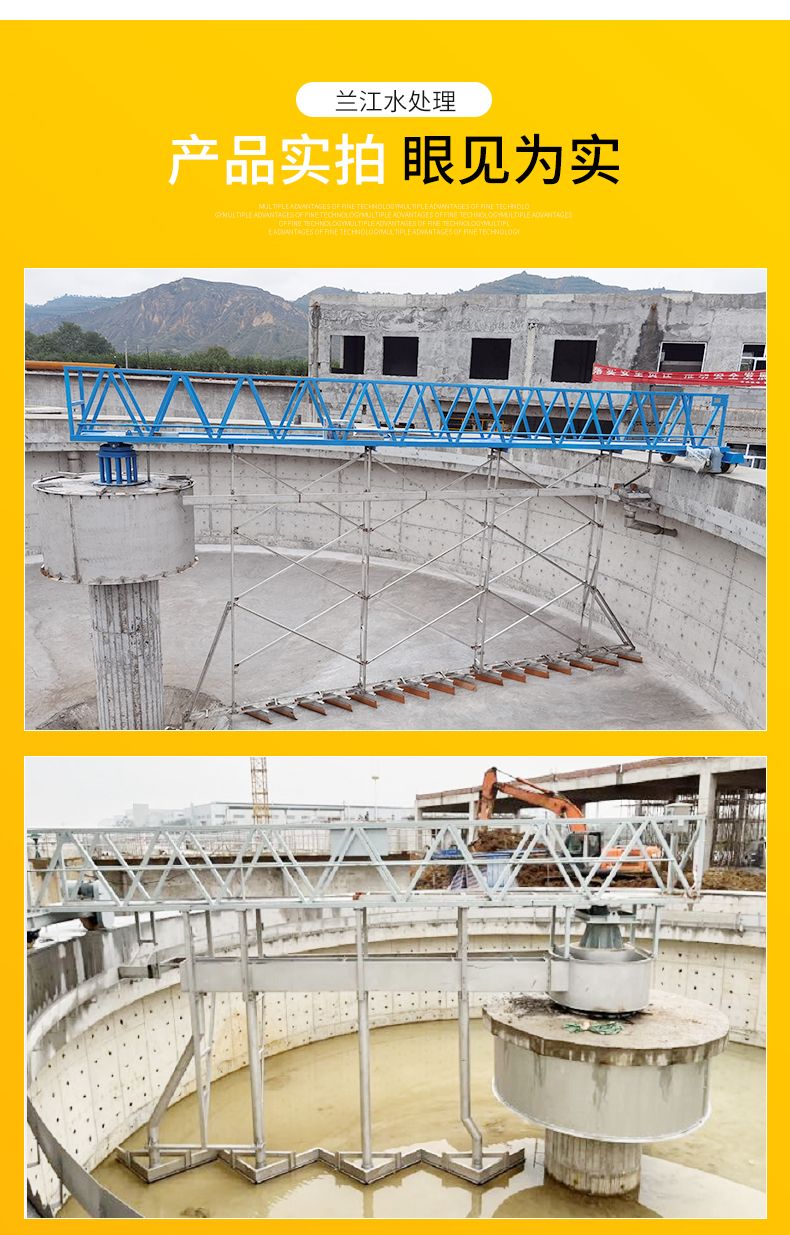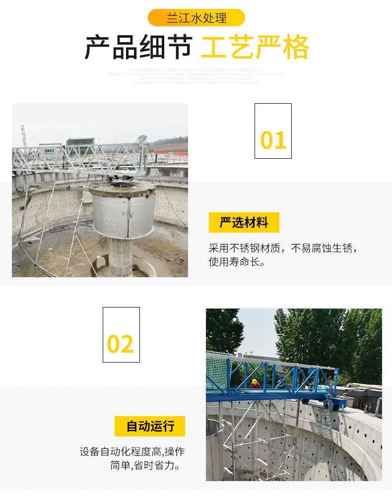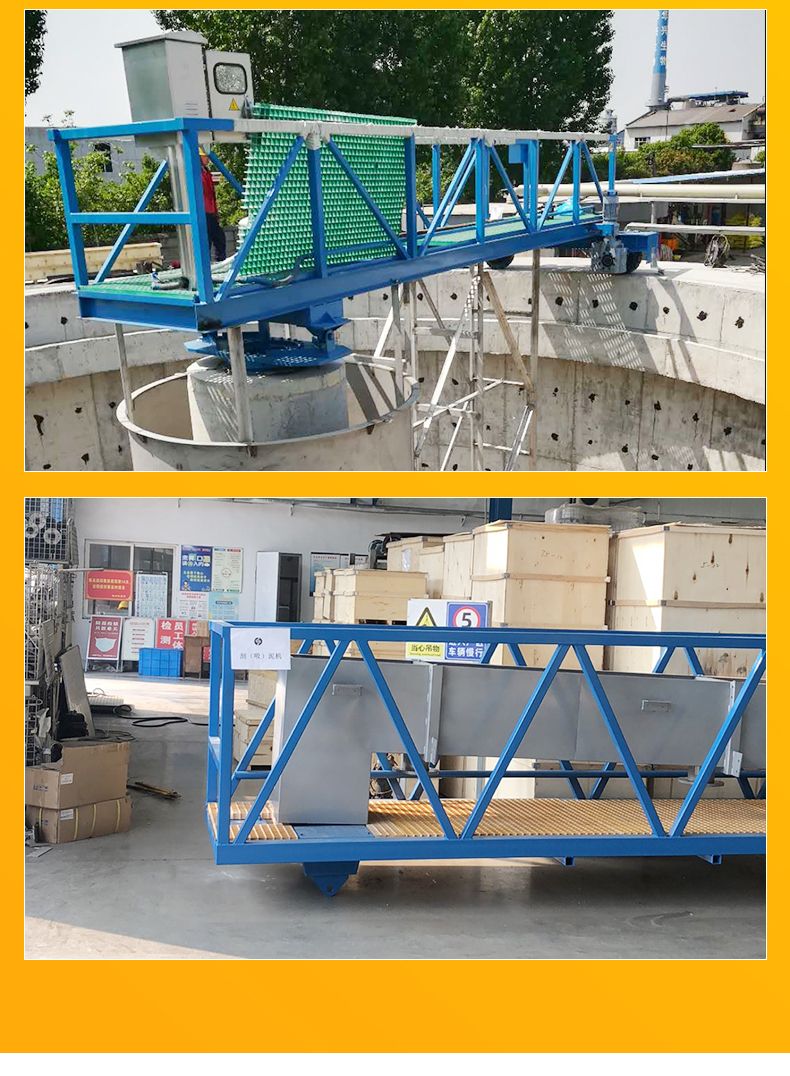 该设备采用中心传动、垂架式,污水进入周边配水槽内,经槽底配水孔均匀流入池内,并在周边挡水裙板的作用下,水流从池底流向中心,污泥依靠自重沉积于池底,从而形成污泥分离,驱动装置驱动中心竖架旋转,并带动刮臂及吸泥管旋转,在静水压力的作用下,污泥均匀地进入吸管上布置的吸口,然后通过中心排泥井的套筒阀排除池外,排泥量的大小可由套筒阀的升降度来控制,水面的浮渣通过撇渣装置撇向池边,再由刮渣耙刮进排渣斗内排出池外。